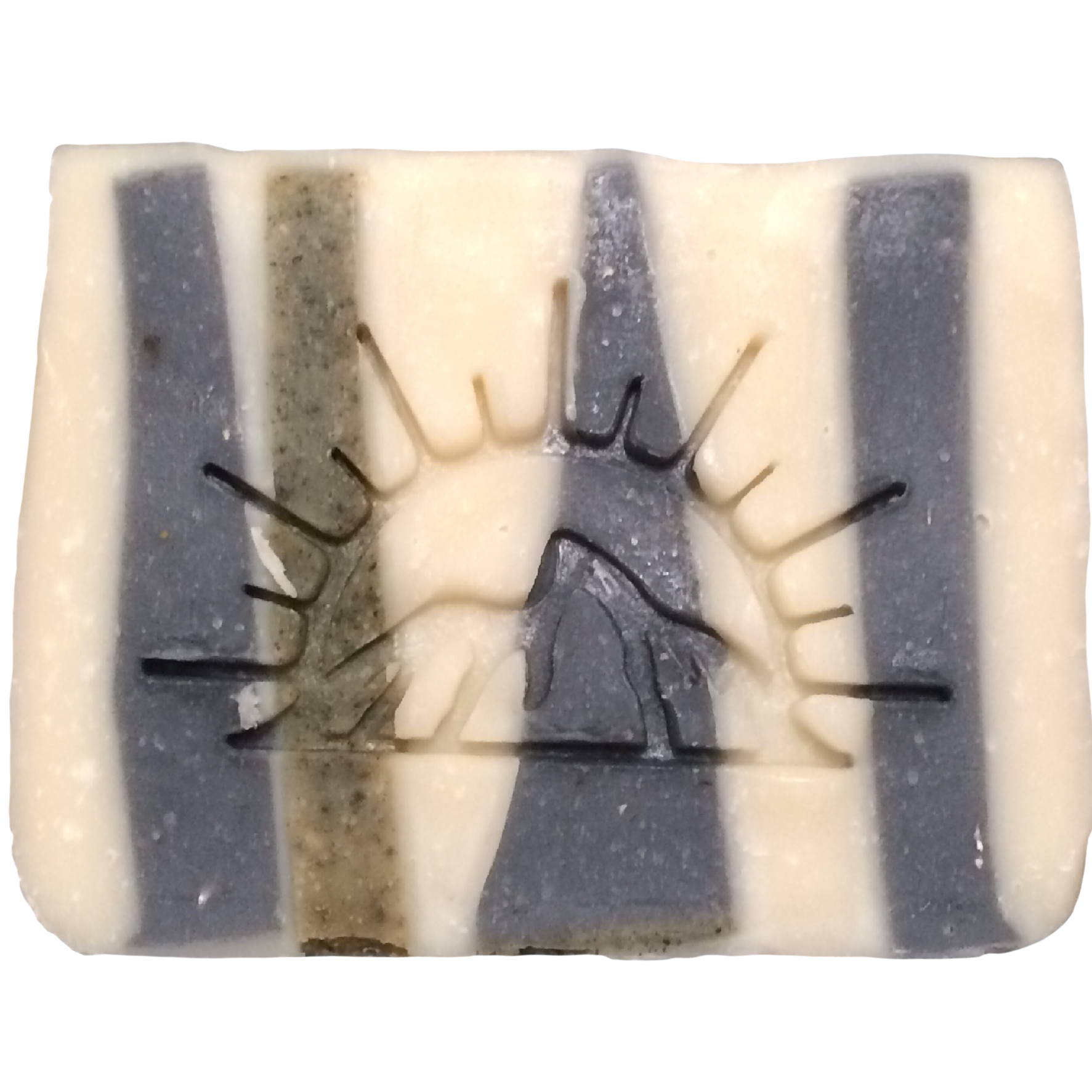 Ingredients: Saponified oils of Olive, Coconut, Palm Kernel*+, Shea Butter*, Castor*; Essential oils of Cedarwood, Fir Needle, Rosemary, Sage; Bentonite Clay; Charcoal Powder; Ground Nettle, Dandelion, Corn Meal, Oats; Tussah Silk.